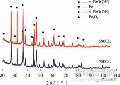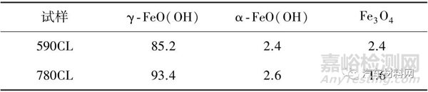(2)590CL 和780CL 的腐蝕產(chǎn)物主要為Fe 的氧化物,兩者腐蝕產(chǎn)物呈針尖發(fā)散的球團(tuán)狀,主要存在形式為γ-FeO(OH),還含有部分α-FeO(OH)和Fe3O4,其中對試樣基體具有保護(hù)性作用的α-FeO(OH)含量較低,說明產(chǎn)生的紅銹對基體基本沒有保護(hù)作用。