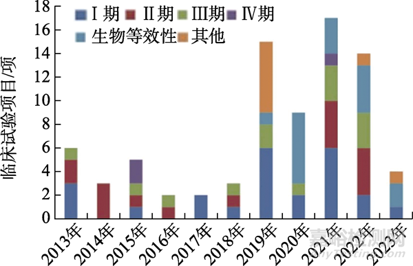 國家藥品監(jiān)督管理局藥物臨床試驗(yàn)登記與信息公示平臺(tái)自開放注冊日至2023年3月29日,共登記了80項(xiàng)鼻用噴霧劑注冊臨床試驗(yàn)。從發(fā)展趨勢上看,中國鼻用噴霧劑臨床試驗(yàn)數(shù)量從2019年開始迅速增長,2019年數(shù)量較2018年增加了4倍。2019—2023年注冊臨床試驗(yàn)共59項(xiàng),占比高達(dá)73.8%,其中Ⅰ期臨床試驗(yàn)17項(xiàng)(28.8%)、Ⅱ期臨床試驗(yàn)7項(xiàng)(11.9%)、Ⅲ期臨床試驗(yàn)9項(xiàng)(15.3%)、Ⅳ期臨床試驗(yàn)1項(xiàng)(1.7%)、生物等效性試驗(yàn)17項(xiàng)(28.8%)、其他(藥動(dòng)學(xué)/藥效學(xué)研究)共8項(xiàng)(13.6%)。