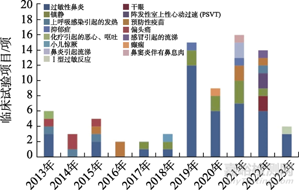 中國注冊臨床試驗(yàn)鼻用噴霧劑的適應(yīng)證包括過敏性鼻炎、鎮(zhèn)靜、干眼、陣發(fā)性室上心動(dòng)過速(paroxysmal supraventricular tachycardia,PSVT)、上呼吸道感染引起的發(fā)熱、抑郁癥、偏頭痛、化療引起的惡心嘔吐、感冒引起的流涕、小兒驚厥、癲癇、鼻炎引起流涕、鼻竇炎伴有鼻息肉、Ⅰ型過敏反應(yīng)、預(yù)防性疫苗,共15種類型。其中過敏性鼻炎有41項(xiàng)(51.3%),占比最高。
