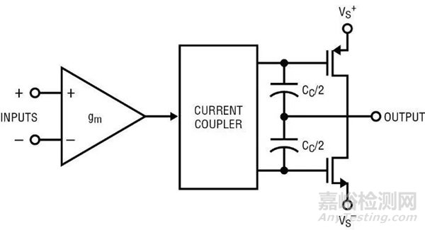 圖 1a 顯示了一個(gè)非軌至軌放大器的方框圖。輸入控制 gm 方框,gm 方框驅(qū)動(dòng)增益節(jié)點(diǎn),并在輸出端得到緩沖。補(bǔ)償電容器 Cc 是主要的頻率響應(yīng)組件。Cc 的返回引腳應(yīng)該接地,如果有這樣一個(gè)引腳的話;但是運(yùn)算放大器傳統(tǒng)上不接地,電容器電流會(huì)返回一個(gè)或兩個(gè)電源。圖 1b 是最簡(jiǎn)單的軌至軌輸出放大器的方框圖。輸入方框 gm 的輸出電流通過“電流耦合器”發(fā)送,這將驅(qū)動(dòng)電流分成兩部分,提供給輸出晶體管。頻率響應(yīng)由兩個(gè) Cc/2s 決定,二者實(shí)際上是并聯(lián)的。