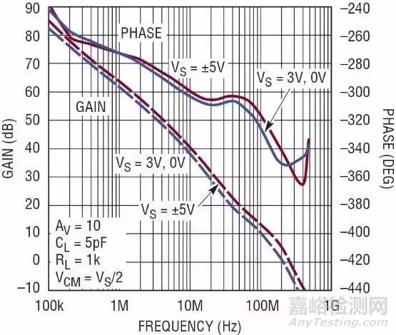 雖然 LTC6268 在單位增益條件下是相當(dāng)穩(wěn)定的,但是有少量故意不穩(wěn)定的運(yùn)放。通過把放大器補(bǔ)償設(shè)計(jì)為僅在較高閉環(huán)增益下保持穩(wěn)定,設(shè)計(jì)折衷能夠提供比單位增益補(bǔ)償方案更高的轉(zhuǎn)換速率、更寬的 GBF、和更低的輸入噪聲。圖 3 示出了 LTC6230-10 的開環(huán)增益和相位。該放大器打算在數(shù)值為 10 或更大的反饋增益條件下使用,因此反饋網(wǎng)將至少使輸出衰減 10 倍。通過這個(gè)反饋網(wǎng)絡(luò),我們可以找到開環(huán)增益為 10V/V 或 20dB 時(shí)的頻率,并發(fā)現(xiàn)在 50MHz (±5V 電源) 時(shí)相位裕度為 58°。單位增益時(shí),相位裕度僅約 0°,放大器會(huì)振蕩。