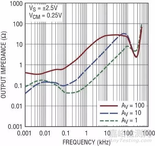 就像反饋電容可能損害相位裕度一樣,負(fù)載電容也能起到同樣的作用。圖 6 顯示在幾種增益設(shè)定值情況下,LTC6268 輸出阻抗隨頻率的變化。請(qǐng)注意,單位增益輸出阻抗低于較高增益時(shí)的輸出阻抗。全反饋使開環(huán)增益能夠降低放大器的固有輸出阻抗。因此圖 6 中,增益為 10 時(shí)的輸出阻抗一般是單位增益時(shí)輸出阻抗的 10 倍。由于反饋衰減器降低了環(huán)路增益,繞環(huán)路增益為 1/10,否則就會(huì)降低閉環(huán)輸出阻抗。開環(huán)輸出阻抗約為 30,這一點(diǎn)在增益為 100 這條曲線的高頻平坦區(qū)域很明顯。在這個(gè)區(qū)域,從增益帶寬頻率/100 左右到增益帶寬頻率,沒有足夠的環(huán)路增益來降低開環(huán)輸出阻抗。
