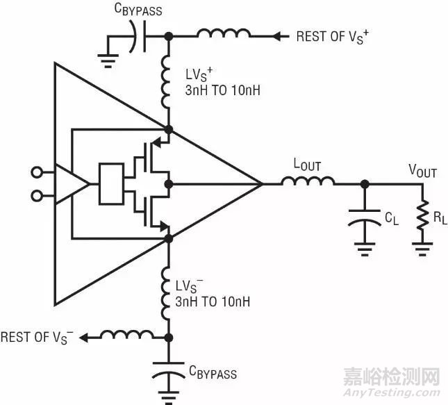 最后一個(gè)需要考慮的振蕩源是電源旁路。圖 10 顯示了輸出電路的一部分。LVS+ 和 LVS– 是不可避免的封裝、IC 接合線、旁路電容器的物理長(zhǎng)度 (像任何導(dǎo)體一樣也是電感性的) 以及電路板走線的串聯(lián)電感。還包括將局部旁路組件連接到電源總線其余部分 (如果不是電源平面) 的外部電感。盡管 3nH 至 10nH 看起來似乎不大,但是在 200MHz 時(shí),就是 3.8 至 j12Ω。如果輸出晶體管傳導(dǎo)大的高頻輸出電流,那么在電源電感兩端會(huì)存在壓降。