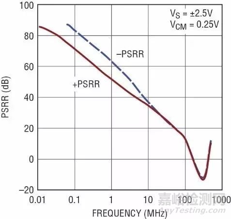 放大器的其余部分需要無噪聲電源,因?yàn)檫@些部分不能隨著頻率變化抑制電源噪聲。在圖 11 中我們可以看到 LTC6268 隨頻率變化的電源抑制比 (PSRR)。在所有運(yùn)算放大器中,因?yàn)闆]有接地引腳,所以補(bǔ)償電容器都連接到電源,會(huì)將電源噪聲耦合到放大器中,gm 必須抵消這種噪聲。由于補(bǔ)償,PSRR 隨著 1/f 降低,而且過了 130MHz 后,電源抑制實(shí)際上在變大。在 200MHz 時(shí),因?yàn)?PSRR 的增大,輸出電流可能干擾 LVs 電感器內(nèi)部的電源電壓,通過 PSRR 的放大,干擾變成很強(qiáng)的放大器信號(hào),驅(qū)動(dòng)輸出電流、產(chǎn)生內(nèi)部電源信號(hào)等,導(dǎo)致放大器振蕩。這就是所有放大器的電源都必須用電感很小的走線和組件精心旁路的原因。此外,電源旁路電容器必須比任何負(fù)載電容都大得多。