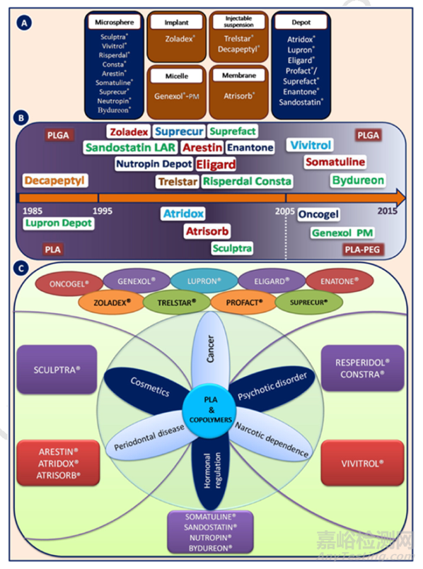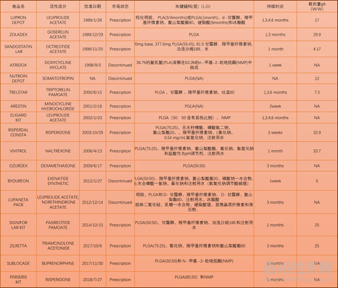 FDA批準(zhǔn)的第一個(gè)長效注射劑是基于PLA/PLGA遞送系統(tǒng)的醋酸亮丙瑞林(商品:LUPRON),目前已經(jīng)可提供 6 個(gè)月的API的duration。實(shí)際上,第一款基于該聚合物體系的上市產(chǎn)品是1986年歐盟批準(zhǔn)的的醋酸曲普瑞林(商品:DECAPETYL)。