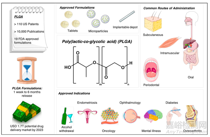 長效控釋制劑具有調(diào)節(jié)藥物釋放、保護(hù)API避免提前失活、無需重復(fù)給藥和提高患者依從性等優(yōu)點(diǎn)??蒯屚緩剑诜?、注射、透皮、植入)制劑形式有微/納米球、凝膠、薄膜和丸劑??勺⑸涞奈⑶蚴沁@些形式中最受歡迎的制劑形式。大多數(shù)上市的長效注射劑配方由聚合材料組成,其中PLGA占有該類產(chǎn)品的半壁江山。