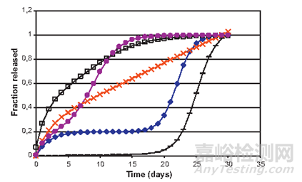 經(jīng)典釋放曲線第一階段為突釋(表面上的未包封藥物顆?;蚩拷砻娴乃幬锓肿右子谕ㄟ^水合作用進(jìn)入)。爆發(fā)釋放的其他原因也可能是裂縫的形成和顆粒的分解。第二階段通常是緩慢釋放階段,藥物緩慢擴(kuò)散,同時(shí)聚合物降解和水合進(jìn)行。第三階段(第二次爆發(fā))通常是快速釋放期(侵蝕的開始)。