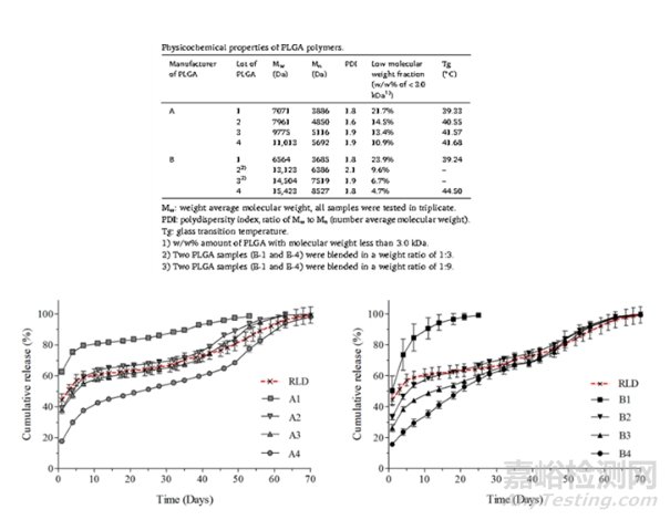 一般來說,大量藥品從微球中不受控制的爆發(fā)釋放可能導(dǎo)致不良的副作用和毒性。既然是人工合成的聚合物,那么單體乳酸和羥基乙酸的隨機(jī)聚合必然會(huì)影響終產(chǎn)物PLGA的性質(zhì)。Ochi M et al., 發(fā)表的一份《PLGA分子量分布對(duì)亮丙瑞林微球釋放的影響》的研究表明,亮丙瑞林的釋放不僅依賴于PLGA的分子量,還依賴于PLGA的重量分布。