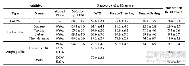 一份研究研究顯示了氨基酸的穩(wěn)定作用(水溶液穩(wěn)定性),包括脯氨酸、賴氨酸和苯丙氨酸,顯著提高了艾塞那肽的水穩(wěn)定性(氨基酸可能通過優(yōu)先相互作用來穩(wěn)定肽。脯氨酸可以形成兩親性超分子組裝體,防止蛋白質(zhì)聚集。疏水性芳香族氨基酸苯丙氨酸往往存在于疏水性內(nèi)部或肽的跨膜片段中。在這樣的位置上,它可以在肽穩(wěn)定中發(fā)揮多種作用)。這些氨基酸的效果相對(duì)不如非離子表面活性劑泊洛沙姆188和蔗糖。水溶性添加劑中泊洛沙姆188的效果最好(可以降低表面張力,誘導(dǎo)肽在空氣/水界面的吸附減少,從而減少二級(jí)結(jié)構(gòu)的變化和肽的不穩(wěn)定)。糖類中蔗糖和海藻糖是蛋白類產(chǎn)品(單抗、多抗和ADC)中常見的穩(wěn)定劑,它通過水替代和玻璃化作用產(chǎn)生保護(hù)作用。本實(shí)驗(yàn)中蔗糖是在凍融和凍干的實(shí)驗(yàn)中表現(xiàn)最好且具有提高包封率效果。