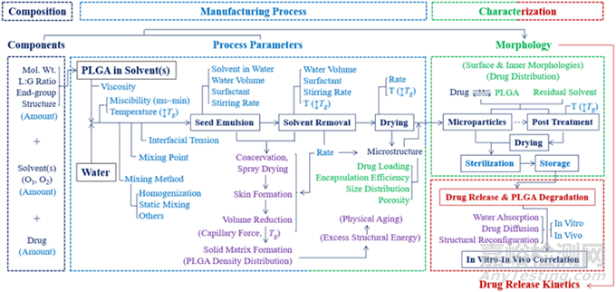 圖9:PLGA微粒的制造流程圖(乳化法)以及影響配方性能的參數(shù)