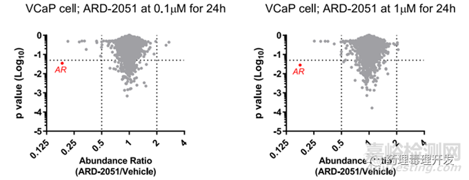 另外,需額外關注非特異性結合及可能引起的脫靶毒性。關于脫靶毒性,傳統(tǒng)小分子通常會開展受體譜、激酶譜的研究,以確定藥物可能影響的信號通路,或可能導致的次要藥理學作用。TPDs類產品則不同,由于這類產品靶蛋白端結合什么,就可能降解什么,因此需要對各種蛋白的濃度進行監(jiān)測,以確定是否出現可能脫靶降解。關于蛋白脫靶,也不能像小分子似的,選擇一組常見的受體或者酶進行篩選。TPDs需要對大量的已知和未知的蛋白質進行廣泛評估,該文章推薦的關鍵技術是蛋白質組學研究。蛋白質組學技術其實在科研院所用的比較多,是從整體的角度,分析細胞(或組織等)內動態(tài)變化的蛋白質組成成份、表達水平與修飾狀態(tài),能更全面的評估可能的在靶或脫靶蛋白變化。如下圖所示,一個靶向AR受體的PROTAC候選分子ARD-2051,采用蛋白質組學技術在VCaP細胞系中,對>5700蛋白質進行了分析,以評估ARD-2051的選擇性,選擇DMSO處理的細胞作為對照,結果顯示ARD-2051在0.1、1μM濃度可以將AR蛋白水平降低82%以上,且AR是唯一濃度降低超過2倍的蛋白,說明ARD-2051的選擇性還不錯,沒有明顯的脫靶。
