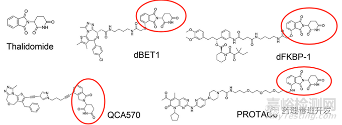 生殖毒性方面,大多數受訪企業(yè)均將胚胎-胎仔發(fā)育毒性試驗的開展節(jié)點前置了。這點與著名的致畸藥物沙利度胺不無關系。因為,CRBN的一個主要配體就是沙利度胺。很多選用CRBN的TPDs里面均含有沙利度胺的結構,如下圖所示。所以,無論擬開發(fā)適應癥是腫瘤還是非腫瘤,這一重大風險均需要引起足夠重視,盡早且全面評估。