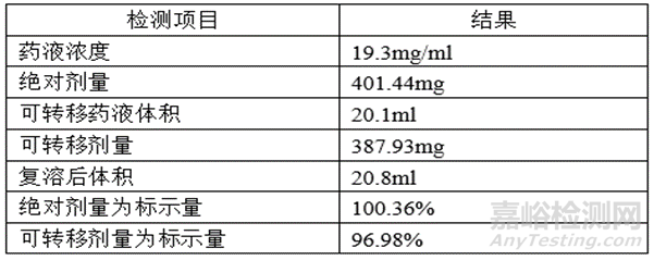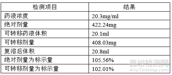 如規(guī)格為0.2g的參比制劑,按照說(shuō)明書(shū)中規(guī)定的使用方法進(jìn)行抽提試驗(yàn)并測(cè)定復(fù)溶后溶液濃度,確定可抽取體積、總體積,計(jì)算出可抽取劑量、總劑量,保證自制制劑實(shí)際可抽取劑量與參比制劑保持一致且不低于標(biāo)示量。