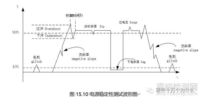 電壓進(jìn)入上升通道之前以及電壓下降到10%之后,是否有Glitch(脈沖尖刺)。電壓上升沿和下降沿有無(wú)負(fù)斜率出現(xiàn)。有無(wú)Overshoot、Undershoot,若有,則以實(shí)際輸出穩(wěn)態(tài)值為基準(zhǔn),測(cè)量Vovershoot、Vundershoot及恢復(fù)時(shí)間Tr(Tr:從第一個(gè)過(guò)沖最大值開(kāi)始到輸出進(jìn)入穩(wěn)態(tài)值所需時(shí)間),進(jìn)入穩(wěn)態(tài)后是否有波動(dòng)跌落(Dip)、下電跌落(Sag)和過(guò)沖(Surge),如圖15.10所示