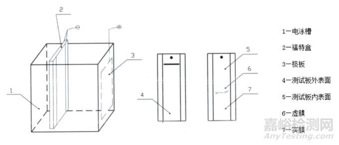 福特盒法又稱拋射盒法,是用PVC塑料為隔條與2塊磷化鋼板固定粘貼,制成上下空,兩邊用膠帶封閉的福特盒。福特盒放入電泳槽中,電泳槽一側(cè)的不銹鋼板接正極,福特盒接負極,電泳后,將福特盒拆卸,試板處理干燥后測量內(nèi)表面涂膜厚度,找出膜厚5µm的位置,測量其至底邊的高度,其數(shù)值即是電泳涂料直觀泳透力值。試驗裝置如圖1所示。