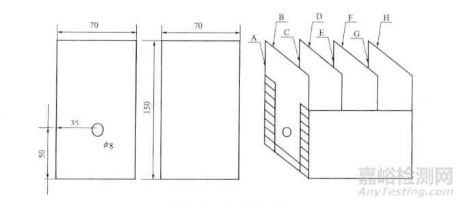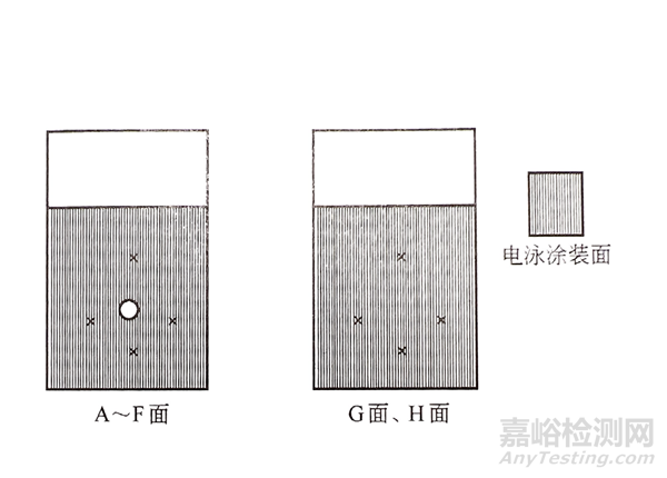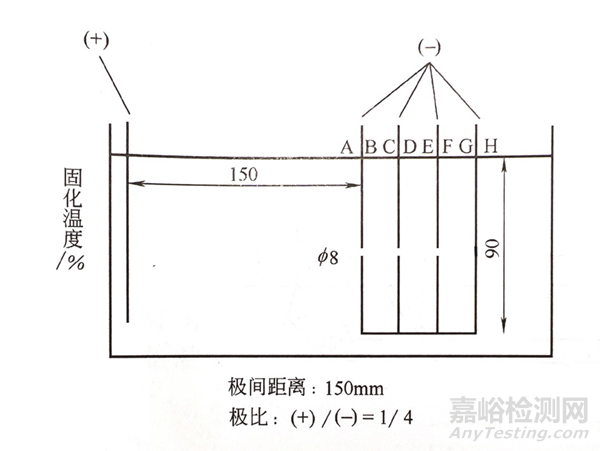 4枚盒法以試板各部位的膜厚作為評價對象,與其他方法相比,更接近于模擬生產(chǎn)實際,直觀反映出材料的消耗量,因此被廣泛采用。用4塊磷化鋼板作為試板固定制成4枚盒,其中3塊距底端50mm中心處鉆孔,試板從左到右順序記為A~H,見圖2。將4枚盒放入電泳槽中,試板之間用導(dǎo)線連接,極板接正極,4枚盒接負極,見圖3。電泳后將盒解體,測出烘干后試板每面“X”4點(試板邊緣到中心距離的中點)的涂膜厚度,取平均值。當(dāng)A面膜厚達到(20±2)µm時,G面膜厚越高,也就是內(nèi)外表面膜厚差越小,表明該涂料的泳透力越好,以 G/A 膜厚比值表示,見圖4所示。