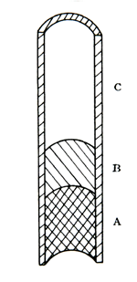 行業(yè)最早使用的測試方法是鋼管滲入法,用于測定泳透力較高的涂料。將鋼管浸入槽液進行電泳,烘干后據(jù)開鋼管,管內(nèi)壁電泳的涂膜呈現(xiàn)A(完全涂有漆層)、B(A與C的過渡部分)、C(完全未涂上漆)三種狀況,量出A、B之高,以HA+HB/2作為漆膜的滲入高度,即為直觀泳透力值,見圖5。其泳透機理為電泳進行時,首先涂覆在被涂物電場分布的最強部位,即幾秒鐘內(nèi)管外壁和管口完全被涂覆,隨著管子外表面涂層電阻增加,電場進入被浸入槽液一端的管子內(nèi),一直涂覆到管子更上端沒有足夠電場來沉積的部位。該方法美中不足的是,每測一個數(shù)據(jù),必須將管子鋸開,否則管內(nèi)壁的電泳狀態(tài)無法直接觀察;也無法保存留樣;且精確劃分 A、B、C部分也較因難,因此長春第一汽車制造廠以此為基礎(chǔ)進行了改進,研制出“一汽鋼管法”,目前該方法收錄在行標中稱為鋼管法B,即將試板插入不銹鋼管內(nèi),浸入槽液200mm,極板為緊貼絕緣容器內(nèi)壁的薄紫銅片圍成的圓筒,引出導(dǎo)線進行電泳,測量試板上虛膜長度(A)和實膜長度(B),用公式涂膜泳入高度(A+1/2B)/鋼板條浸入槽液深度(200mm)×100%計算出泳透率,見圖6所示。