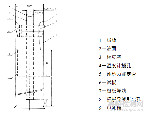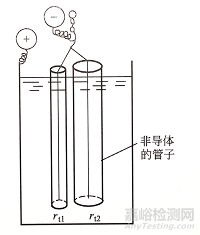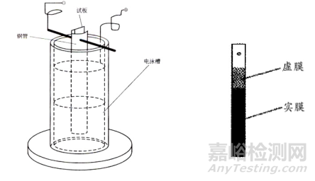 玻璃管法用于陽極電泳涂料,以玻璃圓筒作為電泳槽,上配橡皮塞,橡皮塞中心裝一玻璃管,同時開有溫度計及導(dǎo)線出孔。極板為貼壁于電泳槽內(nèi)上下無底的馬口鐵圓筒,試板插入玻璃管中央,泳畢量取試板兩面泳漆高度,取平均值,見圖7。以三塊試板泳漆高度的平均值為被測試樣的泳透力。行標中的鋼管法A與玻璃管法裝置、測定方法、結(jié)果表示一致,不同點在于陰陽極對調(diào),用于陰極電泳涂料的測定。