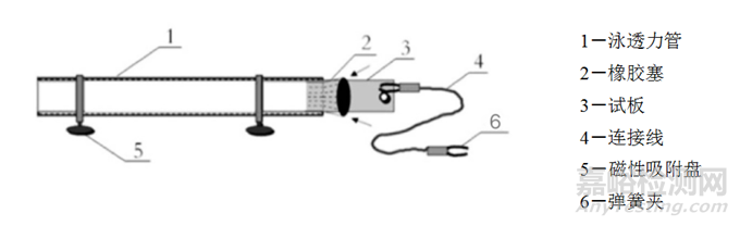 以上方法均需要在實驗室的電泳槽中模擬現(xiàn)場施工環(huán)境才能完成,為便于現(xiàn)場測試,有汽車廠家開發(fā)出一種便攜式泳透力儀器。該儀器由PVC泳透力管、橡膠塞組成,將試板放入泳透力管內(nèi),保持相對固定,從管塞中引出連接線與車身實現(xiàn)電連接,見圖11,將泳透力管固定于待電泳的車身上,且保持豎直方向。泳畢測量試板上膜的范圍,與標準進行對照,從而判定泳透力是否在合格的范圍內(nèi)。便攜式泳透力儀器制作簡單,成本低、體積小、輕便易攜,用于現(xiàn)場測試,可避免因人為因素對測量結(jié)果的影響,具有很好的實用性。