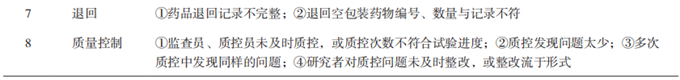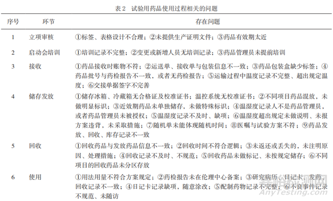 試驗用藥品貫穿于臨床試驗立項審核、啟動培訓(xùn),及藥品接收、儲存、發(fā)放、回收及退回環(huán)節(jié),需要相關(guān)人員嚴(yán)格把控每個環(huán)節(jié),減少相關(guān)問題的發(fā)生,有利于臨床試驗質(zhì)量的提升[15],具體見表2。