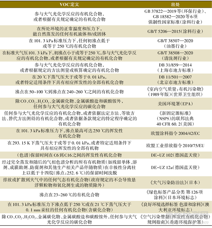 一般說來,VOC包括非甲烷烴類(烷烴、烯烴、炔烴、芳香烴等)、含氧有機(jī)物(醛、酮、醇、醚等)、含氯有機(jī)物、含氮有機(jī)物、含硫有機(jī)物等,是形成臭氧(O3)和細(xì)顆粒物(PM2.5)污染的重要前體物。隨著“VOC”這一術(shù)語在環(huán)境法規(guī)、產(chǎn)品標(biāo)準(zhǔn)中被廣泛使用,以及人們對VOC概念的深入了解,有必要對VOC定義進(jìn)行解讀與總結(jié)。目前,國內(nèi)外對涂料及工業(yè)排放相關(guān)的VOC定義有很多,具體如表1所示。