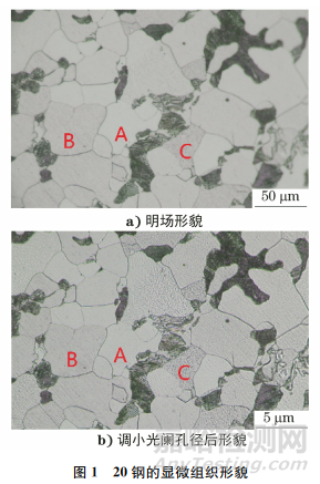 由圖1可知:試樣中珠光體層片狀組織明顯,但大部分鐵素體晶粒發(fā)灰,只有小部分晶粒呈亮白色。將光闌孔徑調(diào)到最小以獲得更清晰、景深更大的圖像,但亮度降低,圖像發(fā)暗。