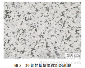 采用尺寸為15mm×18mm(直徑×長度)的20鋼標樣。將20鋼標樣依次用320,600,1000,1500,2000目的碳化硅砂紙進行預磨機磨制,預磨機的轉(zhuǎn)速為700r/min,直到劃痕均勻統(tǒng)一;然后依次用粒度為0.5μm和2.5μm的金剛石磨粒拋光膏對試樣進行拋光,拋光機的轉(zhuǎn)速為1400r/min,加水間隔時間為20s,拋光時間為6min;用4%(體積分數(shù),下同)硝酸乙醇溶液腐蝕試樣7s;最后,將試樣置于光學顯微鏡下觀察,結果如圖1所示。