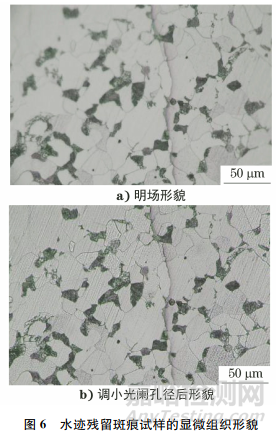 在腐蝕劑中摻入水,擦拭試樣表面后吹干,將試樣置于光學顯微鏡下觀察,結果如圖6所示。由圖6可知:試樣表面產(chǎn)生水跡斑痕,呈片狀分布,該部位為水滴吹干最后位置,顏色呈灰色或黃色,邊界清晰,但未沿晶界分布,水跡內(nèi)的晶粒顏色有灰色和白色,并不是均勻、統(tǒng)一的顏色;調(diào)小光闌孔徑后發(fā)現(xiàn)水跡邊界處晶粒的表面形貌一致,但水跡內(nèi)外的顏色不一致。綜合上述分析,判斷水跡不是灰晶粒的產(chǎn)生原因。