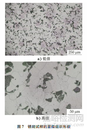 將試樣腐蝕后進行沖水,等待1min后再擦拭試樣表面并吹干,將試樣置于光學顯微鏡下觀察,結果如圖7所示。由圖7可知:試樣表面分布有大面積的銹斑,銹斑呈獨立的小區(qū)域,邊界較為模糊;銹斑呈鐵銹色,顏色暗灰,表面布滿麻點,銹斑未沿晶界分布,大部分是貫穿晶粒的。說明銹斑不是導致灰晶粒形成的原因。