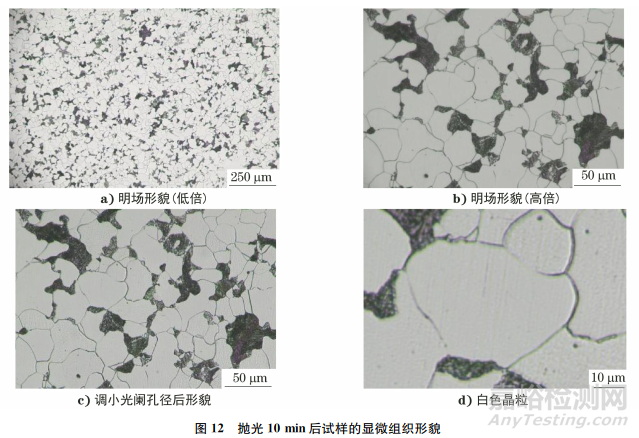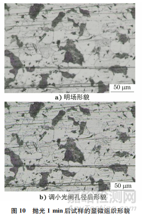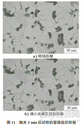 拋光3min后試樣的金相檢驗結果如圖11所示。由圖11可知:試樣表面基本沒有粗大劃痕,殘余較多的細長劃痕,方向沿豎直方向,該劃痕為拋光劃痕;將光闌孔徑調(diào)小后發(fā)現(xiàn)已有部分鐵素體晶粒呈白色,灰色晶粒也變得較淺,且晶粒表面劃痕越深,顏色越灰。