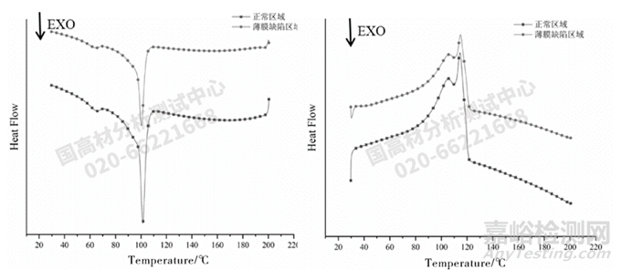 將類似區(qū)域的薄膜缺陷,用鋒利的刀片取樣收集,通過差示掃描量熱儀測(cè)量材料的熔融溫度以及結(jié)晶溫度,如圖5所示。