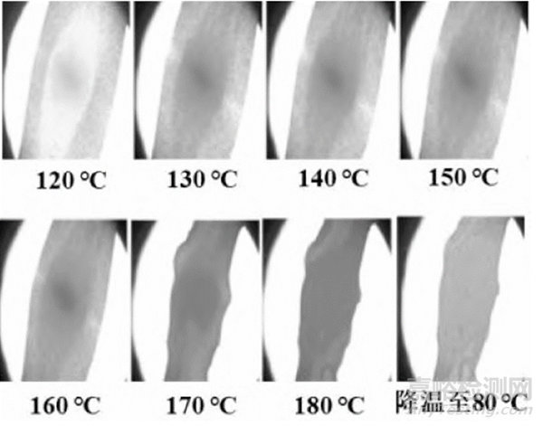 為進(jìn)一步證明該異常區(qū)域是否是由凝膠/過度交聯(lián)引起,對(duì)該區(qū)域的樹脂進(jìn)行顯微熱臺(tái)加熱。從圖中我們可以觀察到薄膜缺陷處材料從120℃緩慢升至180℃的過程中,樹脂材料慢慢融化并和周圍樹脂融為一體,材料冷卻降溫至80℃后,該異常區(qū)域消失和周圍保持一致,這再次表明該缺陷不是由于凝膠/過度交聯(lián)引起的,而是由于基體樹脂塑化不良導(dǎo)致的。