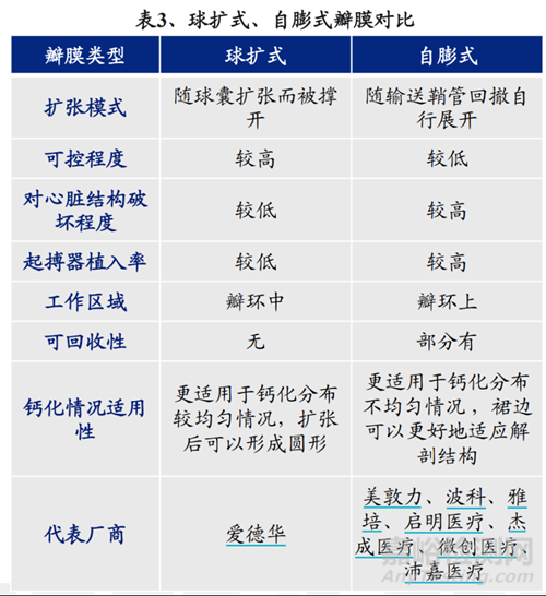 TAVR瓣膜按照擴(kuò)張模式,主要分為球擴(kuò)式和自膨式。施放時(shí),球擴(kuò)式瓣膜隨球囊的擴(kuò)張而被撐開在瓣環(huán)平面(即環(huán)中瓣);自膨式瓣膜隨輸送鞘管的回撤自行膨脹展開,工作區(qū)域位于原有瓣環(huán)之上(即環(huán)上瓣)。