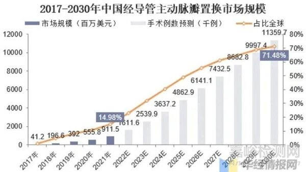目前國內(nèi)整體規(guī)模仍較小,滲透率較低,數(shù)據(jù)顯示2021年我國TAVR市場(chǎng)規(guī)模僅為9.1億美元左右,占比全球市場(chǎng)14.98%,作為全球的醫(yī)療市場(chǎng)之一,預(yù)期隨著國內(nèi)技術(shù)水平逐步接近世界領(lǐng)先水平,占比全球市場(chǎng)份額有望持續(xù)提升,預(yù)計(jì)到2030年市場(chǎng)規(guī)模將達(dá)113.6億美元嗎,占比全球可達(dá)71.5%。