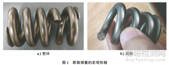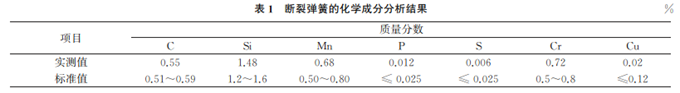 在斷裂彈簧上取樣,對試樣進行化學成分分析,結果如表1所示。由表1可知:該斷裂彈簧的化學成分滿足標準要求。