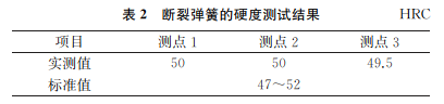 在斷裂彈簧上取樣,對試樣進行硬度測試,結果如表2所示。由表2可知:該斷裂彈簧的硬度滿足標準要求。