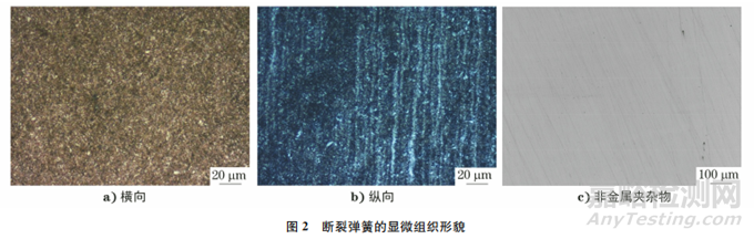 在斷裂彈簧斷口位置取樣,對試樣進行金相檢驗,結果如圖2所示。由圖2可知:該斷裂彈簧的顯微組織為回火屈氏體,符合技術要求;其縱向組織呈流線狀,有輕微的成分偏析,可見少量硫化物非金屬夾雜物,依據 GB/T 10561—2005《鋼中非金屬夾雜物含量的測定 標準評級圖顯微檢驗法》對該夾雜物進行評級,結果為A類細系0.5級、B類0級、C類0級、D類0級,未見明顯異常。