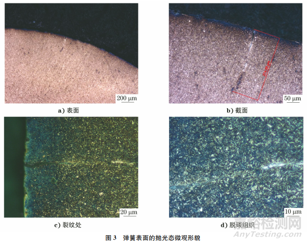 在彈簧表面取樣,用顯微鏡對試樣的拋光態(tài)形貌進行觀察,結果如圖3所示。由圖3可知:彈簧表面未見明顯氧化脫碳,彈簧內側表面存在向內擴展的裂紋,裂紋深度約為0.27mm,該裂紋整體呈表面大開口、尾部尖細的形貌特征,說明該裂紋起裂點位于彈簧表面;裂紋內部存在與基體材料有顯著區(qū)別的灰色物質,在裂紋尾部存在完全脫碳組織,該裂紋未見明顯的沿晶開裂特征。