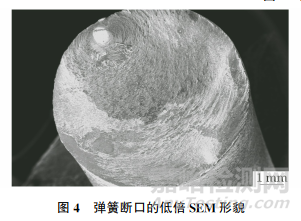 在斷裂彈簧的斷口處取樣,對試樣進行低倍SEM分析,結果如圖4所示。由圖4可知:斷口表面存在裂紋源區(qū)、擴展區(qū)、瞬斷區(qū),斷口大部分為呈貝殼紋特征的擴展區(qū),說明該彈簧主要發(fā)生了疲勞斷裂;裂紋源位于彈簧內側表面,貝殼紋相對于裂紋源位置呈內凹狀,貝殼紋圓心未指向裂紋源,表明該彈簧有較大的應力集中;瞬斷區(qū)靠近彈簧外側表面,未至斷口外緣區(qū)域,面積較小,表明彈簧的斷裂性質為低應力作用下的疲勞斷裂。