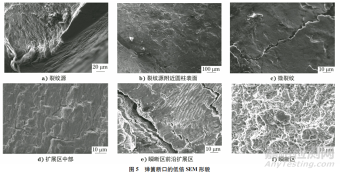 對試樣進行高倍SEM分析,結果如圖5所示。由圖5可知:斷口處有放射性條紋由裂紋源向外輻射,裂紋源區(qū)并無明顯的非金屬夾雜等缺陷;裂紋源附近圓柱表面有明顯的拋丸痕跡,還可見沿縱向分布的微裂紋,該微裂紋位于斷口裂紋源縱向延伸方向;裂紋擴展區(qū)中部有疲勞輝紋和二次裂紋,在瞬斷區(qū)前沿的擴展區(qū)處,二次裂紋深度和寬度均明顯增大;瞬斷區(qū)主要呈剪切韌窩形貌。