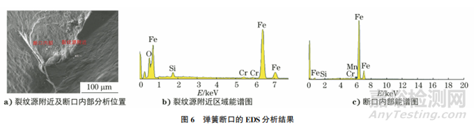 對試樣進行EDS分析,結果如圖6所示。由圖6可知:靠近彈簧表面的裂紋源區(qū)域氧元素含量較高,斷口內部的氧元素含量較低。