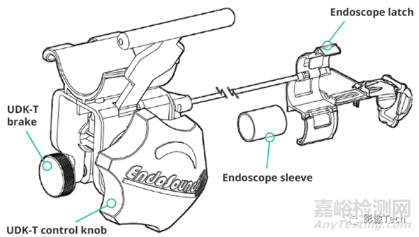 一次性超聲安裝套件(UDK-T):UDK-T制動(dòng)器(用于保持換能器和針頭的位置)、UDK-T控制旋鈕(用于準(zhǔn)確放置換能器并鉸接活檢針)、內(nèi)窺鏡閂鎖(用于將UDK-T組件和超聲換能器模塊固定到視頻內(nèi)窺鏡上)、內(nèi)窺鏡套管(將UDK-T組件固定在各種直徑的內(nèi)窺鏡上的柔性硅膠套管)。