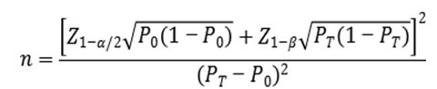 公式中,n為樣本量;Z1-α/2、Z1-β為顯著性水平和把握度的標準正態(tài)分布的分數位,P0為評價指標的臨床可接受標準,PT為試驗體外診斷試劑評價指標預期值。