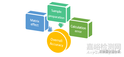 這里為了便于大家理解,我們將準確度稱為總體準確度(Overall Accuracy),它的含義是將測試樣品制備的誤差、基質(zhì)的干擾以及結(jié)果計算的誤差都考慮進去。即
