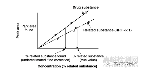 如下圖所示,當(dāng)有關(guān)物質(zhì)方法中雜質(zhì)的相對響應(yīng)因子(RRF)遠小于1時,若我們計算結(jié)果不進行校正,直接采用主峰的線性來計算(如面積百分比計算),那么雜質(zhì)的檢測結(jié)果就會比實際含量低,導(dǎo)致雜質(zhì)被低估。