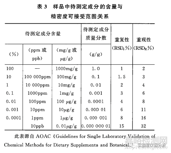 精密度的結(jié)果應(yīng)報告標準偏差、相對標準偏差或置信區(qū)間。樣品中待測定成分含量和精密度RSD可接受范圍參考表3。