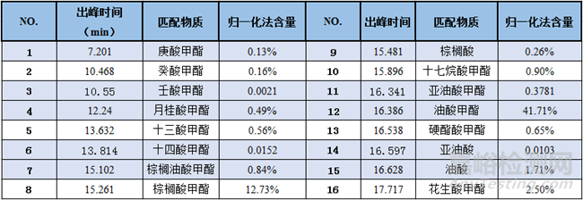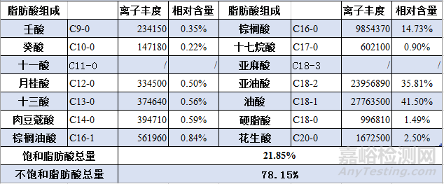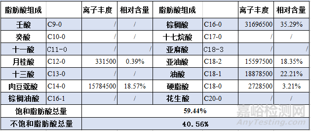 對比例2(自配油脂)GCMS測試的結(jié)果統(tǒng)計