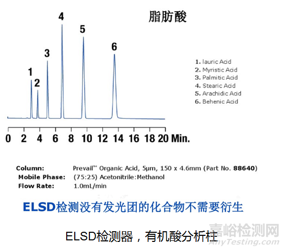 對比方法2,液相色譜測試前處理:同GCMS的前處理,先要用酸將植物油酸化成脂肪酸,再提純后用HPLC測試,需要特殊的色譜柱以及檢測器,測試多種脂肪酸需要多種標(biāo)準(zhǔn)品