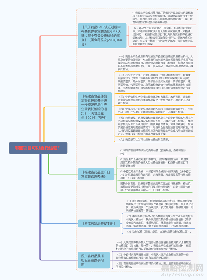 藥品生產(chǎn)企業(yè)需要進行委托檢驗時,應(yīng)當在符合法律法規(guī)及相關(guān)規(guī)定要求條件下實施,那么哪些項目可以委托生產(chǎn)呢?筆者梳理了國家和各省局發(fā)布的相關(guān)政策,摘錄如下圖: