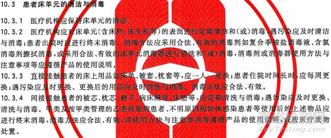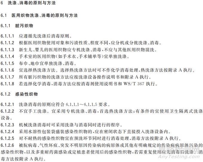 1)對于被細菌繁殖體污染的感染性織物,可使用250mg/L~500mg/L的含氯消毒劑或100mg/L~250mg/L的二氧化氯消毒劑或相當(dāng)劑量的其他消毒劑,洗滌消毒應(yīng)不少于10min;也可選用煮沸消毒(100℃,時間≥15min)和蒸汽消毒(100℃,時間15min~30mm)等濕熱消毒方法。
